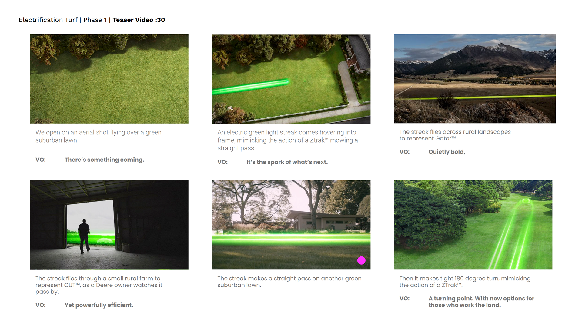 BEFORE REVEALING JOHN DEERE'S LATEST ELECTRIC MACHINES WE DEVELOPED THIS MOVING ENERGETIC LIGHT PATH THAT TRAVERSED THE LANDSCAPE, THIS PATH REPRESENTED ALL OF THE CATEGORIES OF MACHINES DEPENDING ON THE LANDSCAPE. BELOW FOR INSTANCE WAS OUR LIGHT PATH MAKING A SHARP RADIUS TURN IN A RESIDENTIAL LAWN REPRESENTING THE ALL NEW ELECTRIC ZERO TURN MOWER, THE FIRST ALL ELECTRIC MACHINE THAT DEERE LAUNCHED WITH.